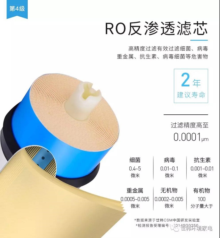 {1}目前世界上能生产RO膜片的企业共计5家(韩国•世韩膜、美国•陶氏膜、美国•GE膜、日本•东丽膜、日本•海德能膜、)世韩膜的销量占首位;其过滤效果稳定,使用寿命长,产水量大,价格合理。